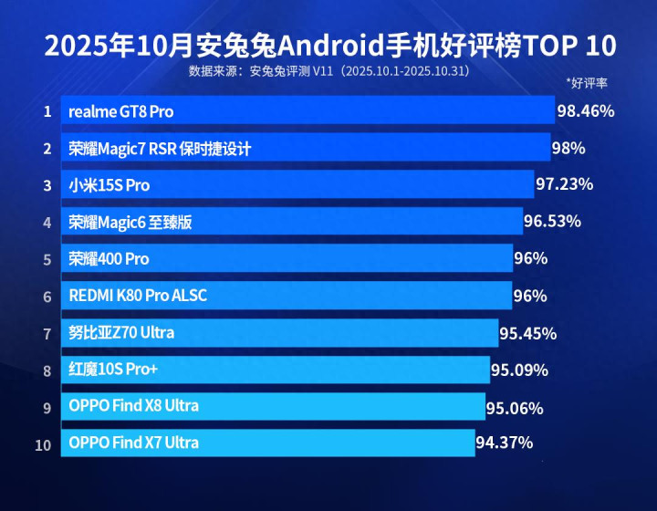 对于2025年10月份安兔兔安卓手机好评榜,亓纪的想法是这样的:在预算允许的情况下,电子产品基本上都是买新不买旧,除非是在芯片翻车的情况下。比较意外的是真我GT8 Pro,或许是安兔兔用户真的很喜欢2K屏幕和2亿像素潜望式长焦镜头吧,至于这几款机型的选购建议,看这篇文章基本上就足够了。
